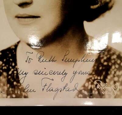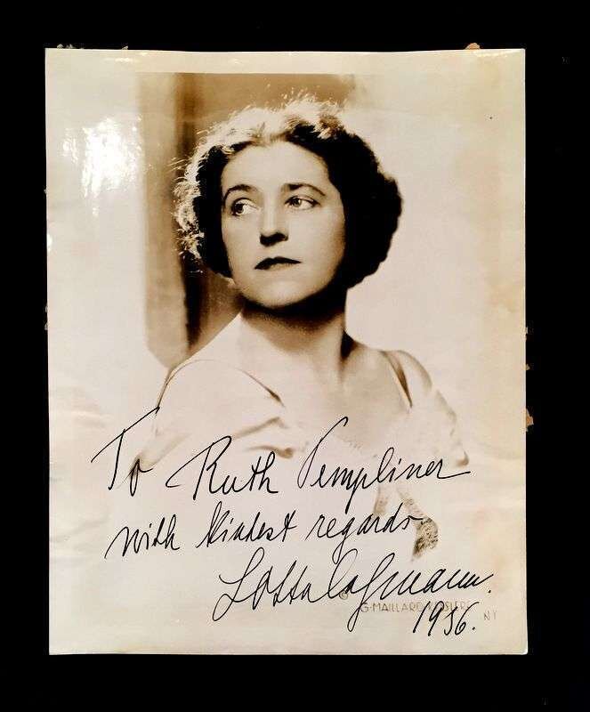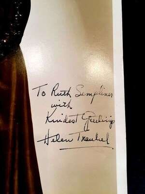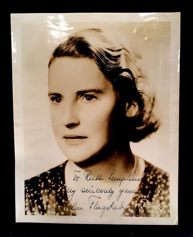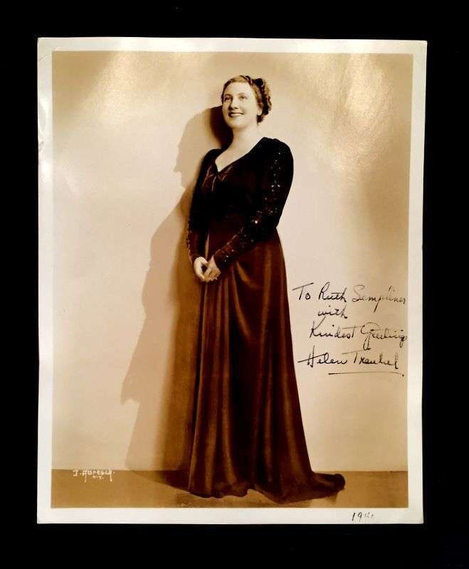 3 Pieces. (Autograph material). Photos inscribed and signed. Opera singers - female Wagnerians: Flagstad, Kirsten. Photo inscribed and signed. Silver print, 10 x 8 inches; 254 x 202 mm; minor creasing at corners, negligible dust smudging at margins. Bust portrait, ca. 1935 - 1940. Inscribed and signed in ink at bottom center of portrait, clear and strong mostly against light portion of portrait. * Lehmann, Lotte. Photo inscribed and signed. Silver print, 10 x 8 inches; 254 x 202 mm; light wear, glue residue at verso edges. Bust portrait. Inscribed, dated, "1936" and signed in ink at bottom third. Clear and strong against white background. * Traubel, Helen. Photo inscribed and signed. Silver print, 10 x 8 inches; 254 x 202 mm; minor wear. Full standing portrait, 1940. Inscribed and signed in ink at bottom middle right background. Clear and strong.