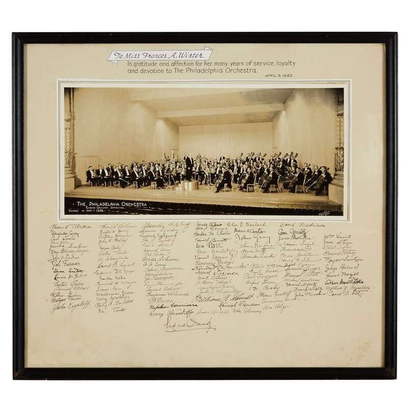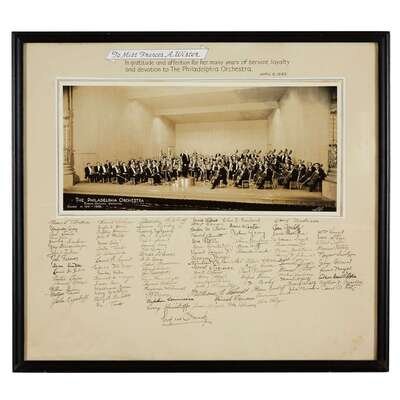 1 Piece. Photo Signed. 8 1/2 x 18 1/4 inches; 215 x 464 mm. In original presentation frame to Frances Wister, signed on the mat below the photo by Eugene Ormandy and 105 Philadelphia Orchestra members. Strong, dark Ormandy signature, other signatures strong and often dark. With frame 23 ¼ x 25 1/4 inches; 590 x 640 mm.