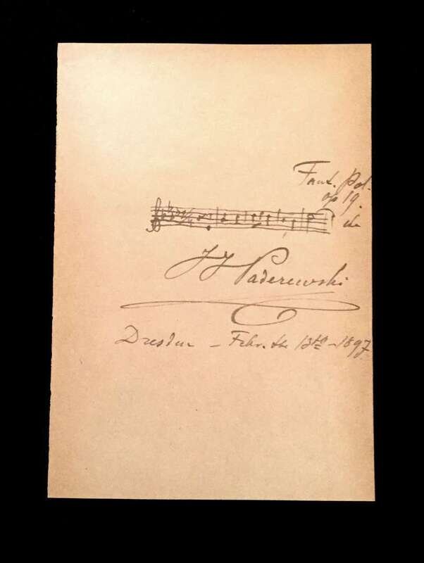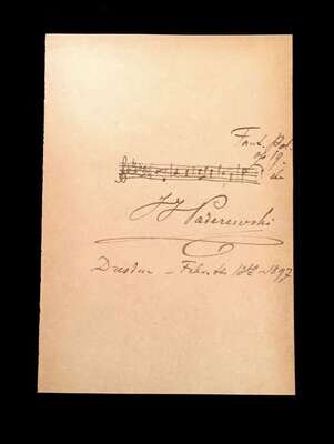 1 Piece. Autograph Music Quotation Signed. Paderewski, I(gancy) J(an). Dresden, Febuary 13, 1897. 4 bars from opus 19 on hand drawn stave. 7 x4 7/8 inches;1 80x125mm- sheet-size. Clear and strong on tan paper.