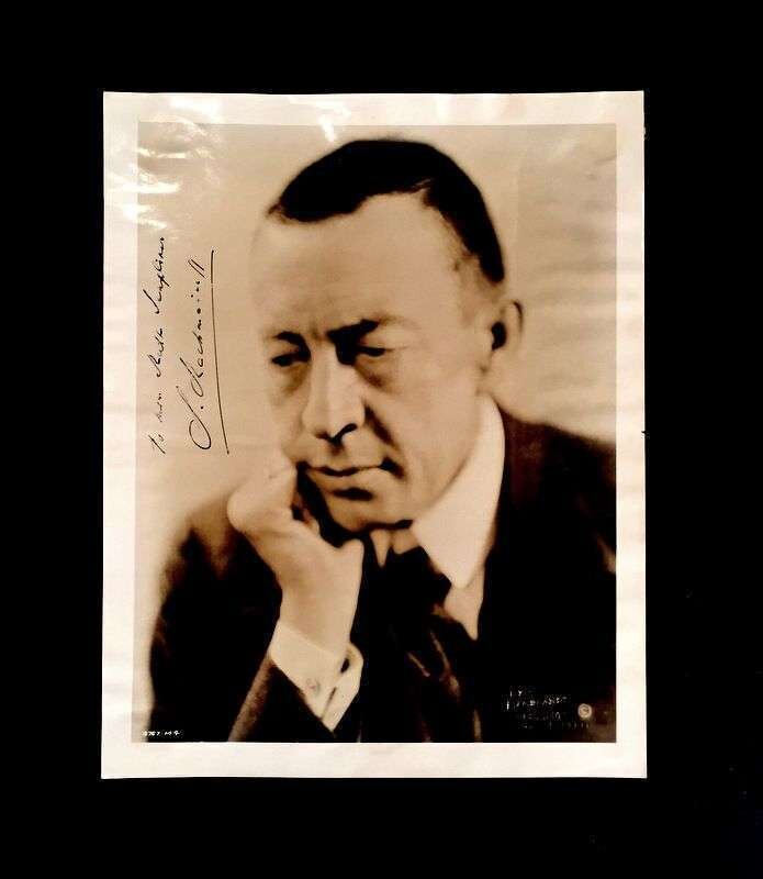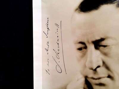 1 Piece. (Autograph material). Rachmaninov, S(ergei). Photograph signed and inscribed. Silver print, 10 x 8 inches; 254 x 202 mm; light creasing, minor surface wear. Bust portrait ca. 1940. Vertical ink presentation inscription in upper left middle background, clear and generally strong.
