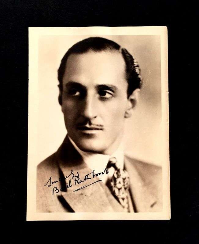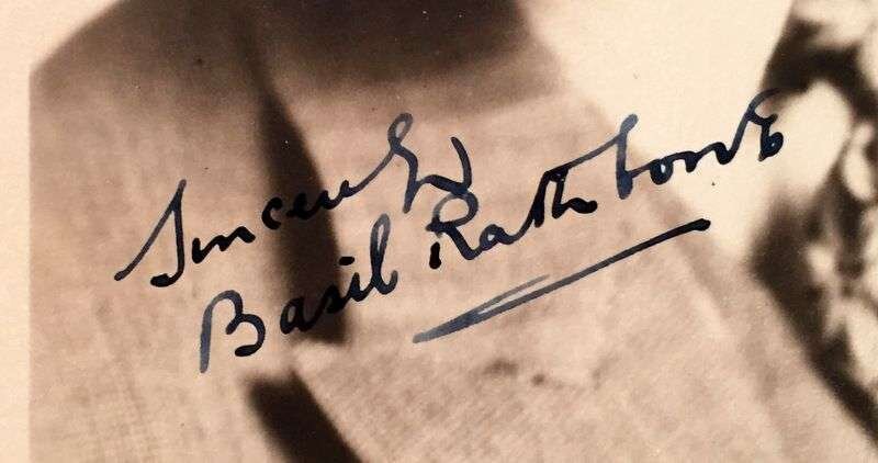 1 Piece. Photograph Inscribed and Signed. Rathbone, Basil. Silver print bust portrait, 7 x 5 inches; 178 x 130 mm; minor creasing, ca.1930. Strong signature at bottom left of portrait.