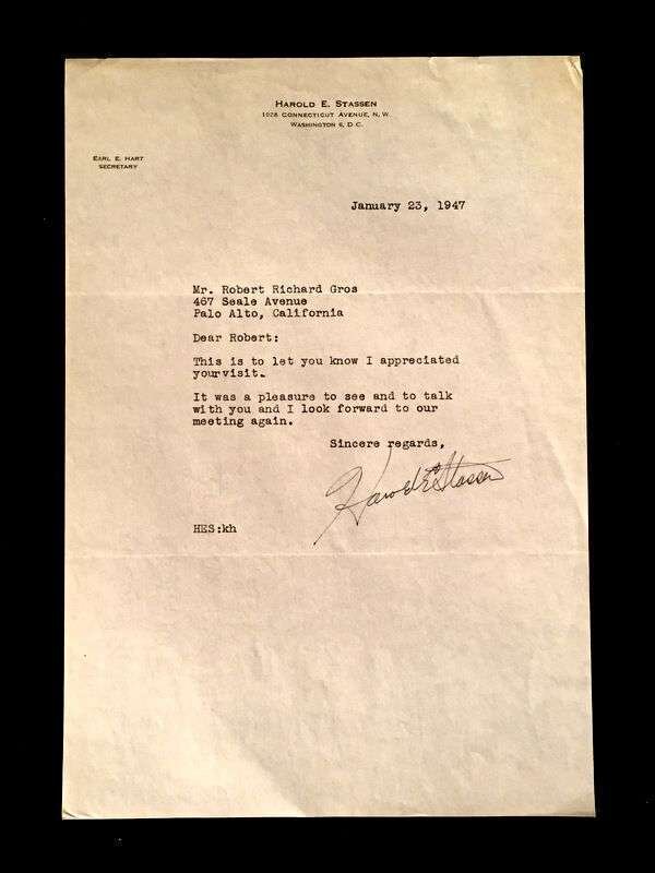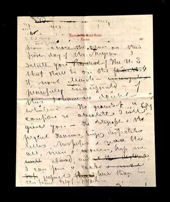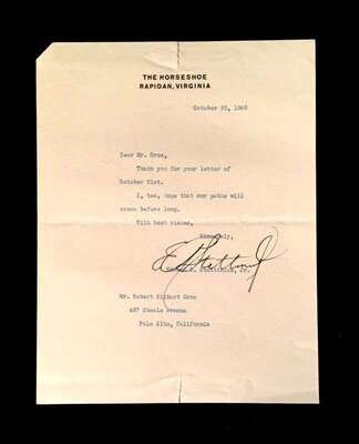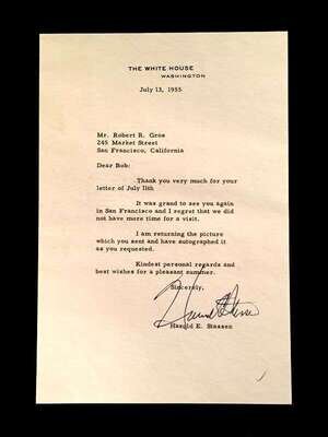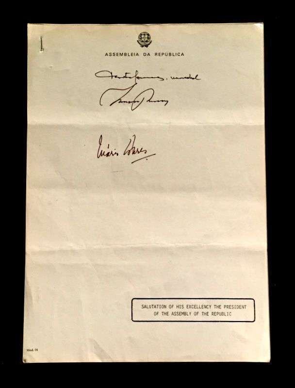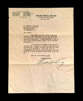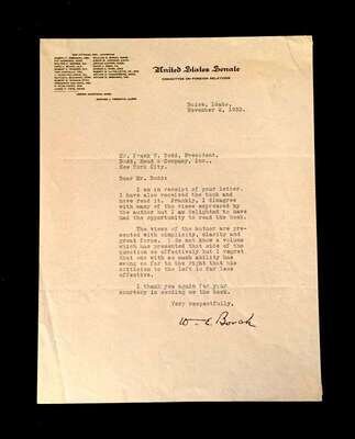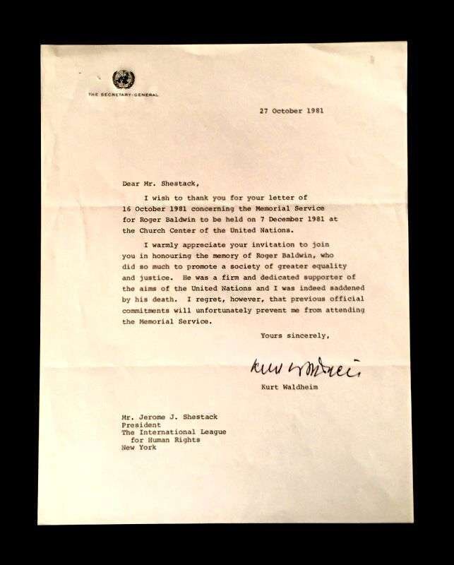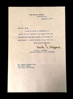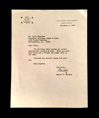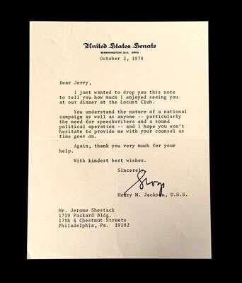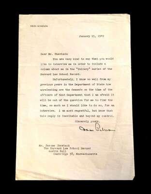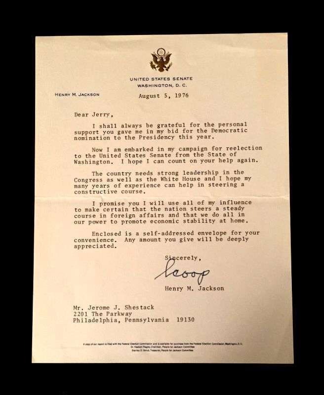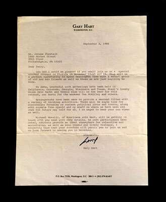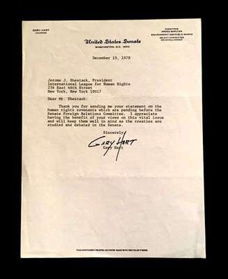 Lot Autograph Material - American and World Political and other Notables: Acheson, Dean, Typed Letter Signed, January 15, 1949, 1p., 4to, to Jerome Shestack.* Bock, Edward W., Autograph Quotation Signed on card, 1923. * Borah, William H., Typed Letter Signed, Boise, November 2, 1933, 1p., 4to. * Clifford, Clark M., Typed Letter Signed, Washington, D.C.: White House, January 8, 1947, 1p, 4to. * Dulles, Allen W., Typed Letter Signed, Washington,D.C.: Central Intelligence Agency, October, 2, 1961, 1p., 4to. * Hart, Gary, Typed Letter Signed, Washington D.C.: U. S. Senate, December 19, 1978, 1p., 4to. * [Hart], Gary, Typed Letter Signed, Washington D.C., September 3, 1986, 1p., 4to, to Jerome Shestack. * [Jackson, Henry M.] Scoop. Typed Letters Signed (2), Washington D.C.: U.S. Senate, October 2, 1974; August 5, 1976, each 1 p. small 4to and 4to, both to Jerome Shestack. * Long, Russell B., Typed Letter Signed, United States Senate, July 31, 1952, 1p. 4to, to Jerome Shestack, Deputy City [Philadelphia] Solicitor, crease touching bottom of signature. * Mondale, Walter. Washington D.C., December 4, 1979, 1p., 4to, on Vice Presidential letter head to Jerome Shestack. * [Pierrepont, Edwards - ambassador to England], Autograph Letter, [London], [1876-77], (to President R. B. Hayes), with related material, 4 sheets. * Rusk, Dean, Typed Letter Signed, University of Georgia, January 8, 1992, 2p., 4to. * Soares, Mario - president of Portugal, Type Script (copy?) Signed, Lisbon, March 9, 1986, 13 small folio sheets on blue paper, presidential address in English. * Stassen, Harold, Typed Letters Signed, Washington,D.C., January 23, 1947; July 13, 1955, each 1p., 8vo and 4to. * Stettinius, Edward R., Jr., Typed Letter Signed, Rapidan,Virginia, October 28, 1946, 1p., 4to. * Waldheim, Kurt, Typed Letter Signed, October, 27, 1981, 1 p., 4to, to Jerome Shestack, President of The International League for Human Rights, on United Nations Secretary General letterhead.Shestack, Jerome, 1923 - 2011, distinguished American Jurist, President of the American Bar Association, U.S. ambassador to the United Nations Commission on Civil Rights.Sold not subject to return."