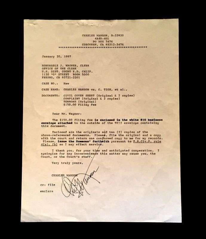 1p, 4to. To Honorable J. Wagner, Clerk, United States Dist. Court E. D. Calif.... Fresno, Ca, Case Name Charles Manson, vs. C. Tigh, et al. Crisp, clean document. Strong signature.