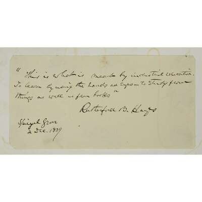 Also including: mounted autograph quotation slip signed, Hayes, Rutherford B. Spiegel Grove, Ohio, Dec. 2, 1889. 2 3/4 x 5 1/2 inches; 70 x 140 mm, "This is what is meant by industrial education..."