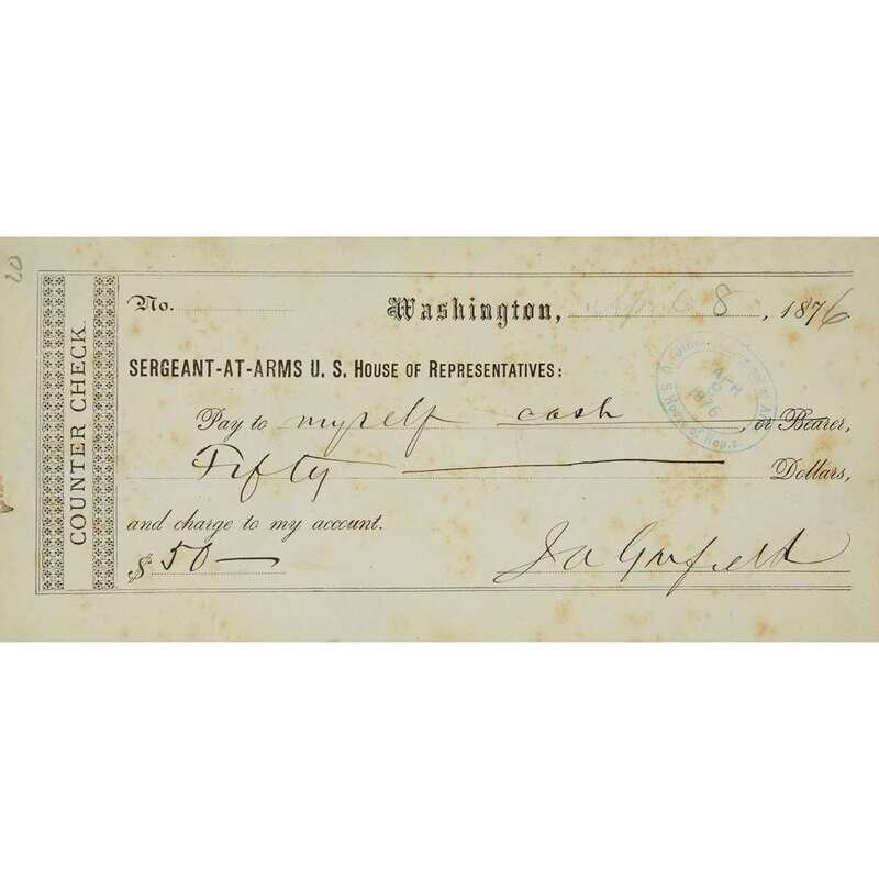 Mounted check signed, Garfield, J(ames) A. Washington, April 8, 1876. Light foxing. Signed as member of Congress.