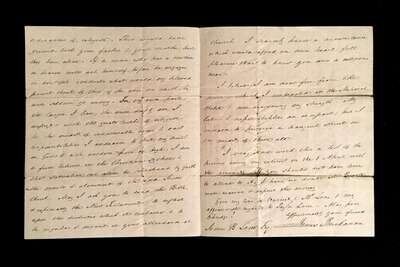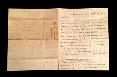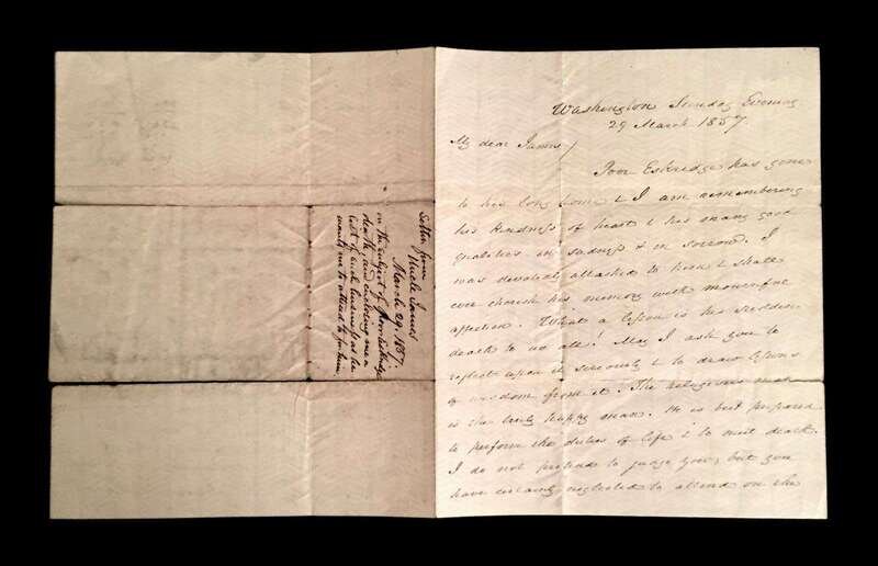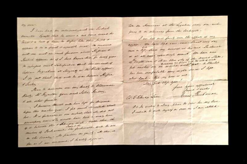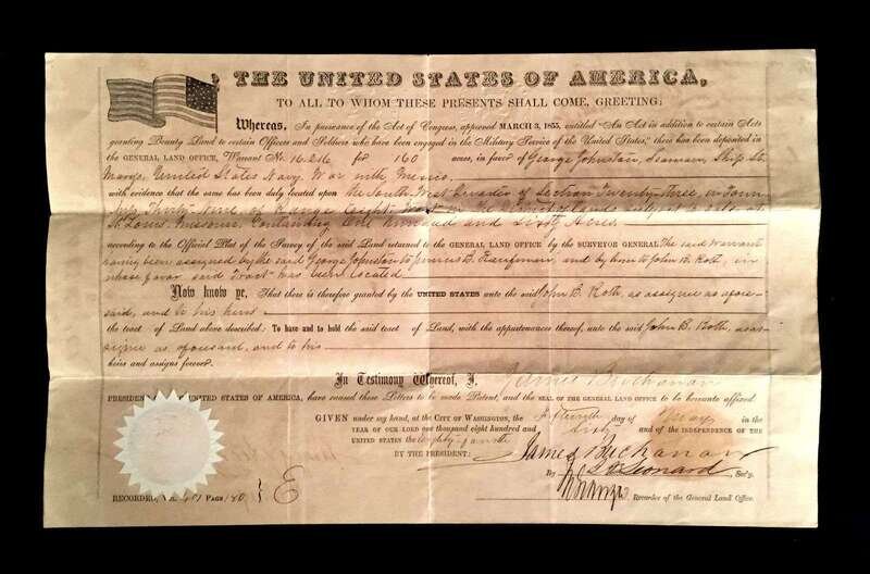 a few small separations - no paper loss. To [his nephew] (Elliott) Eskride (Lane). An affectionate, familial letter, composed with in a few weeks of Buchanan's arrival in London to serve as U.S Minister to the United Kingdom, reporting on the effects of his recent voyage, his appreciation upon the receipt from his nephew of several Lancaster, Pennsylvania newspapers, greetings to other family members. * idem. Autograph Letter Signed. Washington, March 29, 1857. 3pp, with docketed integral page, 4to, creases along old folds, a few small separations - no paper loss. To [his nephew] James (B. Lane), expressing his sorrow at the passing of his nephew Eskridge [James B. Long's brother], closing , "give my love to Harriet & Mrs. Lane & affectionate regards to Taylor Lane. Alas poor Ekridge..." Composed 25 days after assuming the presidency of the United States. * Lot also includes secretarial signed Buchanan presidential land patent, May 15, 1860.