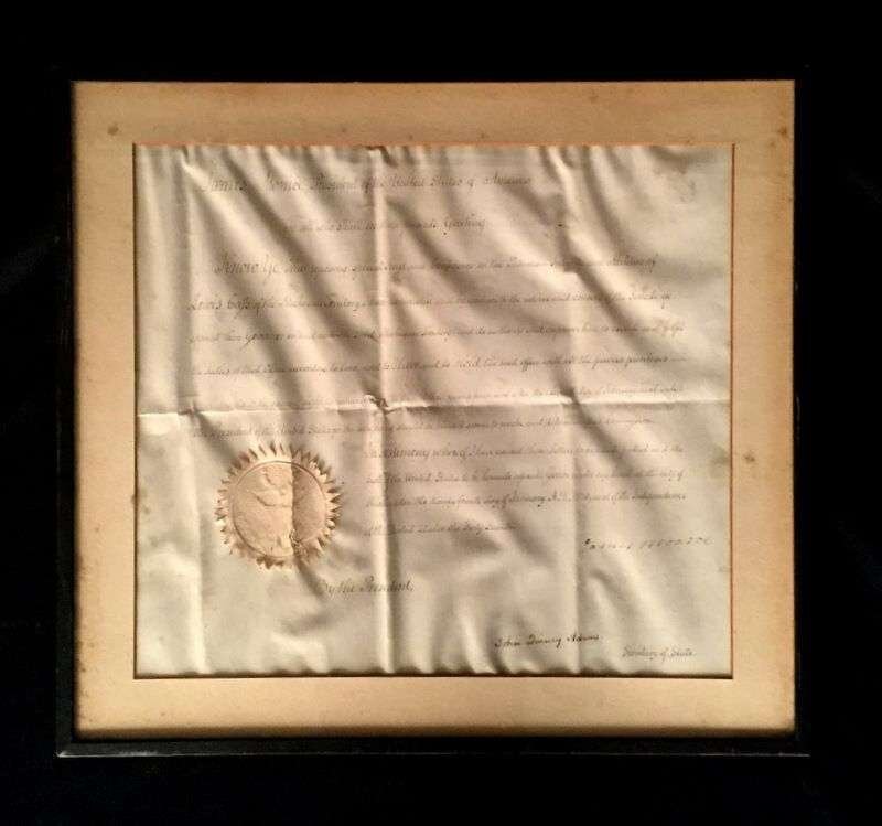 1 Piece. Manuscript. Document Signed. Monroe, James. Washington, January 24, 1820. 1 p., folio on vellum, with paper seal; some creasing, cracking to seal. Appointing Lewis Cass governor of the Michigan Territory. Countersigned by John Quincy Adams. Clear, generally strong signatures; vertical crease through the "d" of Adams. Signed by Monroe as president of the United States