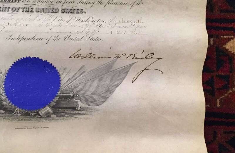 (Autographs : Presidential). McKinley, William. Document Signed. Washington, September 11, 1900. 1p., folio on vellum; minor creasing. Appointing Edward H. Campbell Warrant Machinist in the Navy of the United States. Countersigned by the Acting Secretary of the Navy. With blue paper seal. Signed as President of the United States. Dark, strong signature.