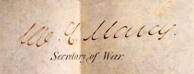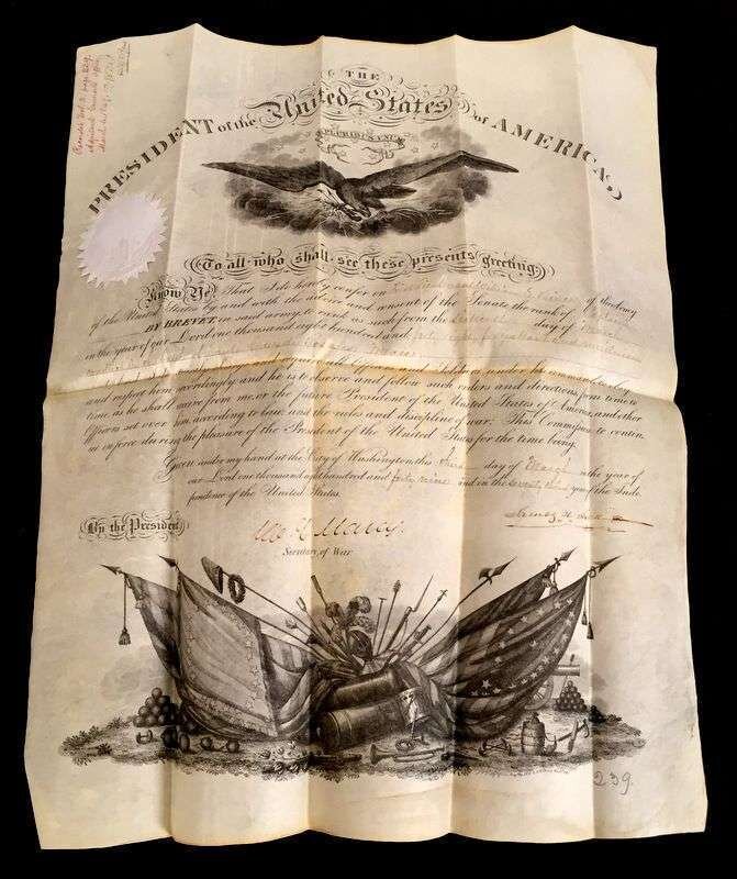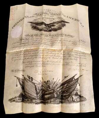 1 Piece. Document Signed - American president. Polk, James. Washington, March 3, 1849. 1 p., folio on vellum; light to moderate creasing along old folds, minor dust smudging at edges. Appointing William E. Polk Captain, Army of the United States. Countersigned by William L. Macy, Secretary of War. Signatures clear but starting to brown, vertical crease through center of "Polk," also a vertical crease between the "L" and "M" of Macy's signature. Paper seal, later ink annotations at upper right. Paper seal, engraved vignettes. Manuscript contents starting to lighten. Signed as president.