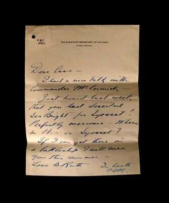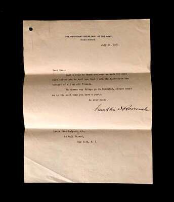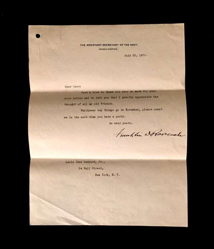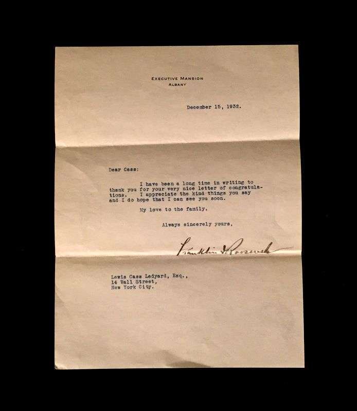 3 Pieces. (Autograph Material). Roosevelt, Franklin D.: Typed Letter Signed. Washington, July 28, 1920. 1 p. 4to, light horizontal creases along old folds. On Assistant Secretary of the Navy letterhead to Lewis Cass Ledyard, Jr. Clipped with 1 p., 4to autograph letter initialed by FDR, addressed, "Dear Cass." * Typed Letter Signed. Albany, December 15, 1932. 1 p., 4to; creases along old folds, to Lewis Cass Ledyard, Esq., thanking him for congratulations [on FDR's election as U.S. president]. Clean dark signatures, crease just below the signature of the December 15, 1932 letter. This signature does not match the stamp used by FDR as governor of N.Y.