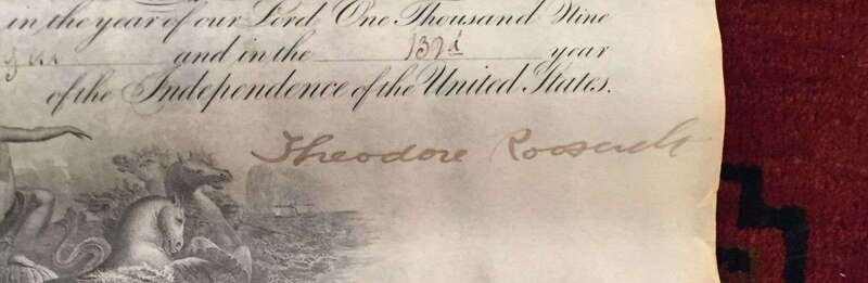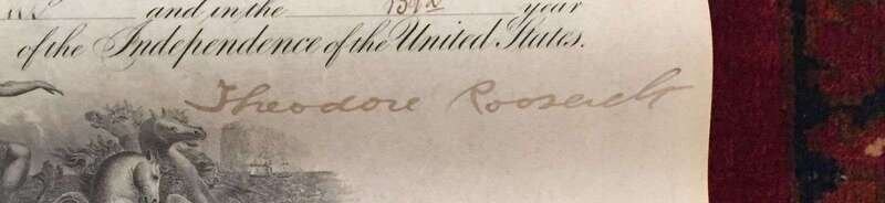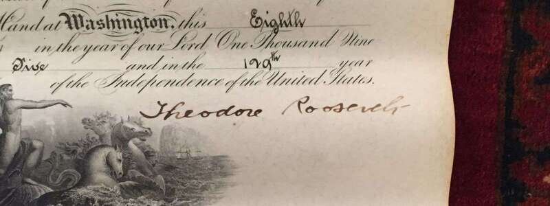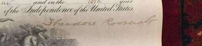 (Autographs : Presidential). Roosevelt, Theodore. Three (3) Documents Signed: Naval Commissions for Edward H. Campbell. All Washington: March 8, 1905. As Ensign. Strong, dark Roosevelt signature, counter signed by Charles H. Darling, Secretary of the Navy. * Two (2) commissions signed on May 19th, 1908, as Lieutenants Junior Grade Lieutenant; Roosevelt signatures starting to brown. Each document 1p. folio on vellum, blue paper seals, minor creasing.