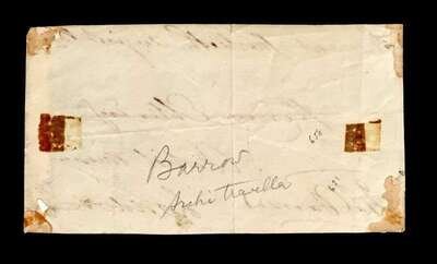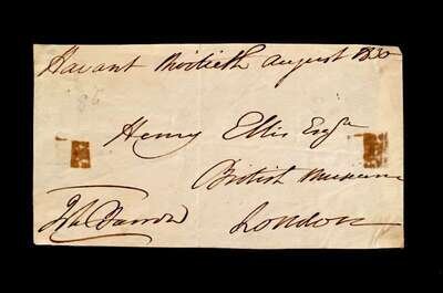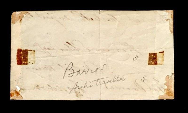 "1 Piece. Autograph Postal address cover panel Signed. Barrow, John. Havant, Aug. 30, 1830. 3 3/8 x 6 inches; 84 x 153 mm; small areas of old cellotape residue. To Henry Ellis, British Museum, London. Barrow, John (1764-1848), First Lord of the Admiralty, champion of polar exploration, Barrow, Alaska named for him."