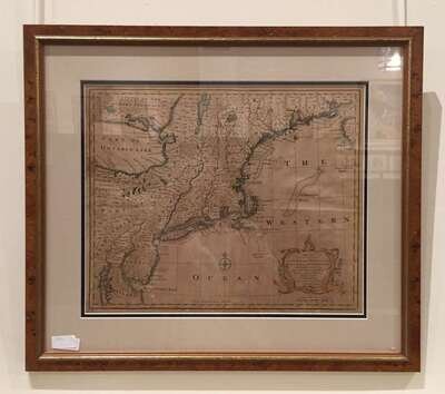 1 Piece. Partly Hand- Colored Engraved Map. Bowen, Eman. " A New and Accurate Map of New Jersey , Pennsylvania, New York, and New England." ( London), (ca. 1747). 17x14 inches; 432x355mm. - neat lines. Trimmed & mounted , moderately to heavily toned, some staining & creasing, a few small abrasions in body. Sold as is.