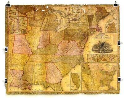 1 Piece. Color Lithographic Map. Young, J. H., publisher. "Mitchell's Reference & Distance Map of the United States." Philadelphia, (1834) [but 1835 or later]. 52 1/4 x 67 inches; 1,325 x 1,700 mm, canvas-backed. Ornamental border, inset maps. Chipping with losses along top of map. Later issue with the Mitchell & Hinman and J.H. Young imprints.