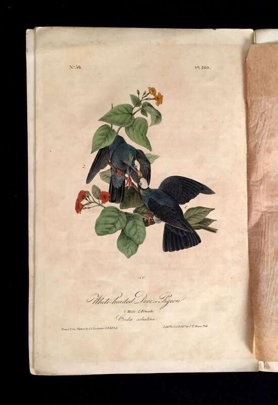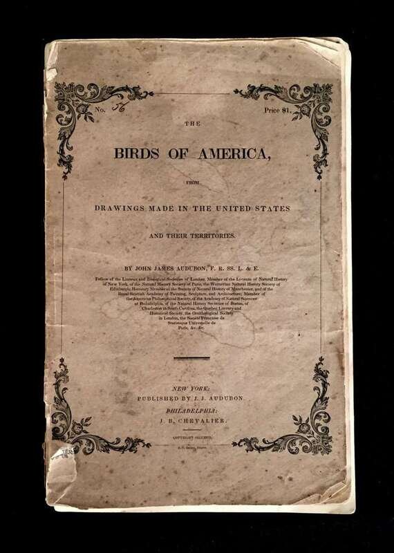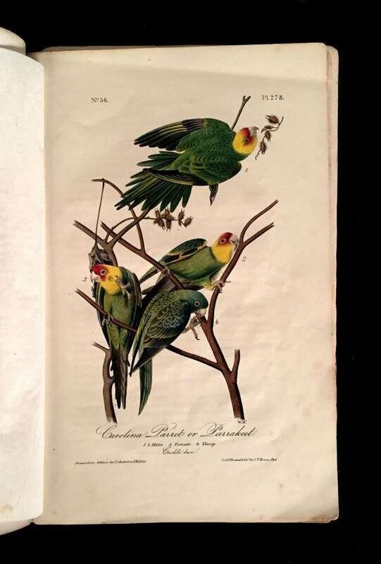 1 vol. No. 56. 8vo, original printed tan wrappers; some staining & foxing, creasing & chipping at corners, spine mostly worn away, binding, braking. With 5 hand colored lithographic plates (nos. 276- 280), including the "Carolina Parrot," tissue guards. Minor foxing to plates, some foxing to text & tissue guards. 1 text leaf torn but complete. With the Vol. 4 title, 1/2 title, contents, & additional subscribers list at back. Plates: Black Billed Cuckoo, Carolina Parrot, Mangrove Cuckoo, Band Tailed Dove. White Headed Dove.