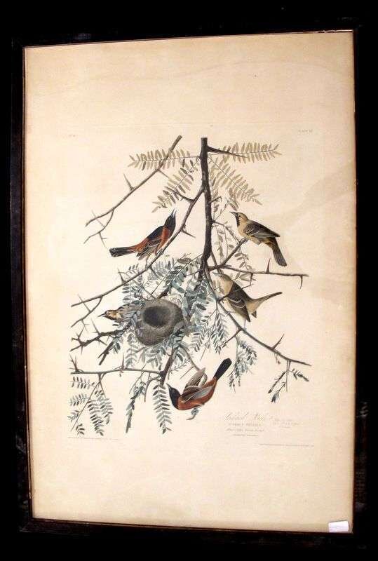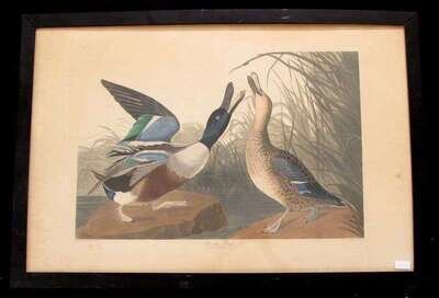 3 Audubon-Havell folios: Orchard Oriole - p42. 39 1/4 x 26 1/4 inches - sheet size. * Downy Wood Pecker - p112. 39 x 26 1/2 inches - sheet size.* Shoveller Duck - p327. 25 x 37 3/4 inches - sheet size. Each mounted to a board, plate marks not visible. Generally clean, scattered light foxing to Shoveller duck.