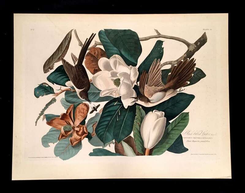 1 Piece. Hand-Colored Engraving with Aquatint and Etching. Havel, R. after Audubon, John J. "Black-billed Cuckoo." London, 1828. [Plate 32, The Birds of America, 1827 - 1838.] 18 5/8 x 26 5/8 inches; 473 x 677 mm - plate mark, 22 15/16 x 29 15/16; 583 x 760 mm - sheet size. With the J. Whatman watermark, dated 1830. Margins trimmed, mounted on board, evenly and attractively toned, some scattered light foxing. Watermark visible despite mounting board.