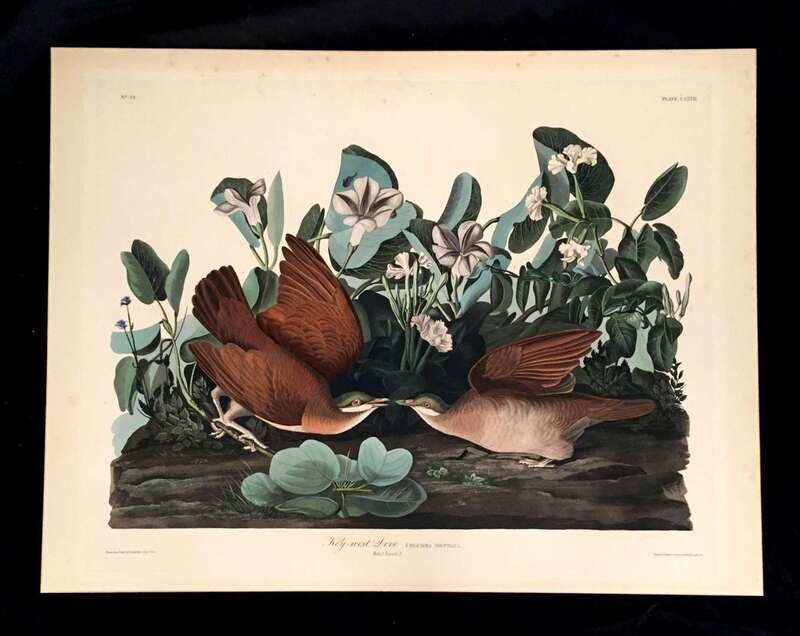 1 Piece. Hand-Colored Engraving with Aquatint and Etching. Havel, R. after Audubon, James, J. "Key-west Dove." London, 1833. [Plate 167, The Birds of America, 1827 - 1838.] 20 13/16 x 26 7/8 inches; 529 x 683 mm - plate mark, 22 7/8 x 29 15/16 inches; 581 x 760 mm - sheet size, with the J. Whatman watermark, dated 1833? Margins trimmed, mounted on board, evenly and attractively toned, scattered light foxing to top of plate and upper margin. Watermark evident and seemingly intact but partly obscured by mounting board.