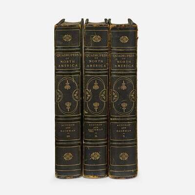 3 Vols. Audubon, John James; Bachman, John. The Quadrupeds of North America. New York: V. G. Audubon, [no date], 1856 - 1860. Tall 8vo, original publisher's 3/4 green morocco and marbled boards, gilt, t.e.g., other edges untrimmed; joints, spine ends and corners rubbed, covers of vol. 1 detached but present. With 155 hand-colored lithographic plates, tissue guards. Plates clean, text leaves occasionally just a little toned, minor foxing to front and back matters. Tall, internally clean set. Bookplates of George Fales Baker, M.D. on front pastedowns. Vol. 1 with V. G. Audubon imprint, but not dated, vols. 2 and 3 each with V. G. Audubon imprint, dated 1856 and 1860 respectively.