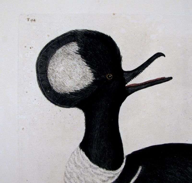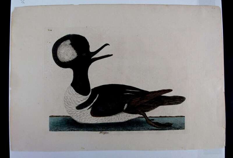 1 Piece. Hand-colored Engraving. "Mergus" [The Round-Crested Duck or Hooded Merganser."] [The Natural History of Carolina... London, 1771, third edition, vol. 1, plate 94.] 10 1/4 x 13 3/8 inches; 260 x 340 mm, wide (full?) margins, on wove paper. Rey scattered, very light foxing, crisp and attractive.