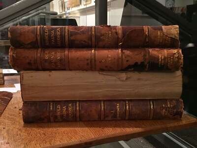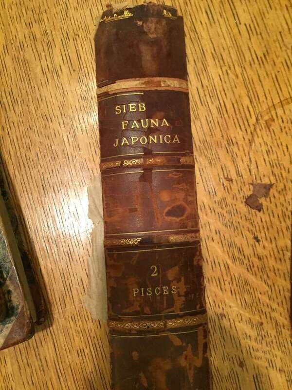 "4 Vols. Siebold, Philipp Franz von. Fauna Japonica. Leiden, 1833 - 1850 [but Tokyo, 1934 - 1937]. 5 vols. in 4, folio, contemporary morocco-backed cloth, spines rubbed and defective, spine of Pisces vol. gone. Internally clean and crisp. This reprint issued in edition of ca. 350 sets.1) Crustacea, 71 plain plates.2) Pisces, 159 mostly colored plates.3 and 4) Mammalia, 30 mostly colored plates; Reptilia, 27 plain plates. Double page map.5) Aves, 89 color plates."