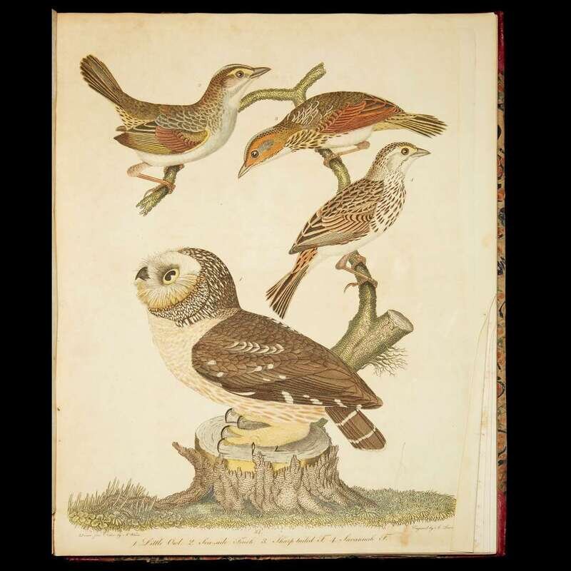 "9 Vols Wilson, Alexander American Ornithology; or the Natural History of the Birds of the United States. Philadelphia: Bradford and Inskeep, 1808 - 1814 [vols. 1 - 6, 8 and 9], 1824 [vol. 7]. Folio, original marbled boards, red morocco back and corners; rubbed and worn, bindings of vols. 1 and 3 broken, front cover of vol. 7 detached but present. With 76 hand-colored plates, tissue guards; plates in vol. 1 generally heavily foxed and toned, fore edge of plate 6 chipped - image and text intact, light to moderate foxing to plates in vols. 2 ,3 and 4, moderate to moderately heavy foxing to plates in vols. 5 and 6, moderate foxing to plates in vols. 7, 8 and 9, a few small, close tears to plate edges in vol. 9, intermittent heavy foxing to text in vol. 6, other moderate foxing to text, moderate to occasionally heavy foxing to tissue guards. First edition of vols.1 - 6, 8 and 9, second edition of vol. 7. Book plates of John A. Brown on front pastedowns.
