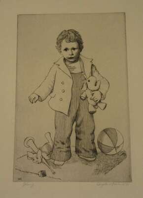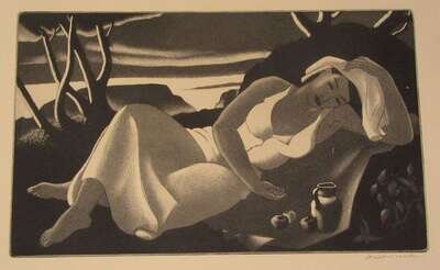4 Pieces. Associated American Artists prints: Grosline, Douglas. "Johnny." Line engraving, 12 7/8 x 7 3/4 inches; 327 x 199 mm, full margins. Titled and signed in pencil below image by Grosline. * Margulies, Joseph. "At Peace." Etching, 10 1/2 x 7 1/4 inches, 265 x 185 mm, full margins. Signed in pencil below image at right by Margulies. * Reed, Doel. "Rest." Aquatint etching, 9 x 14 7/8 inches; 232 x 378 mm, full margins. Signed in pencil below image at right by Reed. * Schreiber, George. "From Arkansas." Lithograph, 12 7/16 x 9 3/16 inches; 316 x 237 mm, full margins. Signed in pencil below image at right by Schreiber. All New York, ca.1938 - 1940. All clean and crisp with original mats and AAA labels. Full sheets.