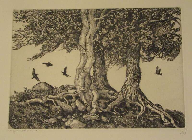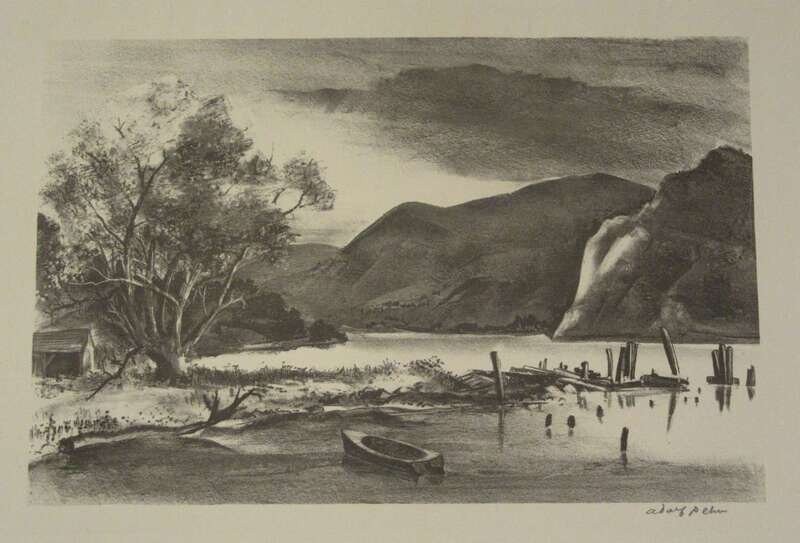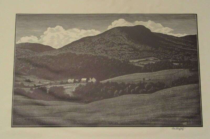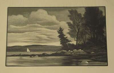4 Pieces. Associated American Artists prints. American Landscapes: Cheffetz, Asa. "Vermont." Wood-engraving, 6 x 9 7/8 inches; 156 x 252mm, full margins, signed in pencil below image at right by Asa Cheffetz. * Dehn, Adolf. "Peaceful Cove." Lithograph, 8 3/8 x 12 3/4 inches; 212 x 323 mm, full margins, signed in pencil below image at right. * Locke, W. R. "Against the Wind." Etching, 8 5/16 x 11 3/4 inches; 210 x 300 mm, full margins, titled and signed below image by W. R. Locke. * Nason, Thomas W. "Eggemoggin Reach." Wood-engraving, 6 x 9 15/16 inches; 154 x 253 mm, full margins, signed in pencil below image at right. All New York, ca. 1940, all clean and crisp with original mats and AAA labels, all full sheets.