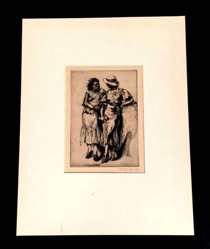 1 Piece. Etching. Bishop, Isabel. Noon Hour. (1935.) (1/250). 6 7/8 x 4 7/8 inches; 175 x 124 mm wide margins, on heavy wove paper sheet, 9 7/8 x 8 15/16 inches; 261 x 210 mm. Moderately light mat burn, slightly toned, hinge mounted at top edge of sheet, verso and recto (corners). Signed in pencil below plate mark at right.