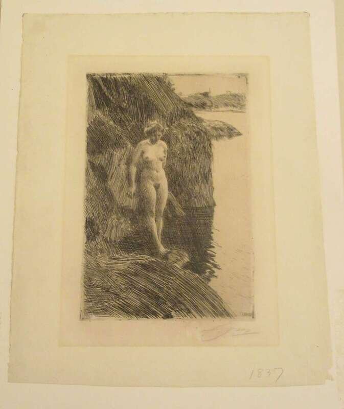 "1 piece. Etching. Zorn, Anders. Precipice. 1909. 9 1/2 x 6 5/16 inches; 241 x 160 mm margins, on cream laid watermarked sheet, 14 1/8 x 11 3/16 inches; 358 x 288mm; light to moderate mat burn, slightly toned, occasional minor dust smudging in blank margins, a few very small scattered abrasions to etched surface at or near the plate mark, hinge mounted at top of sheet verso, old tape repair at bottom right corner of blank margin. Signed and dated in the plate, also signed in pencil below plate mark at right by Anders Zorn.Asplund 228"
