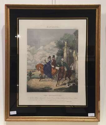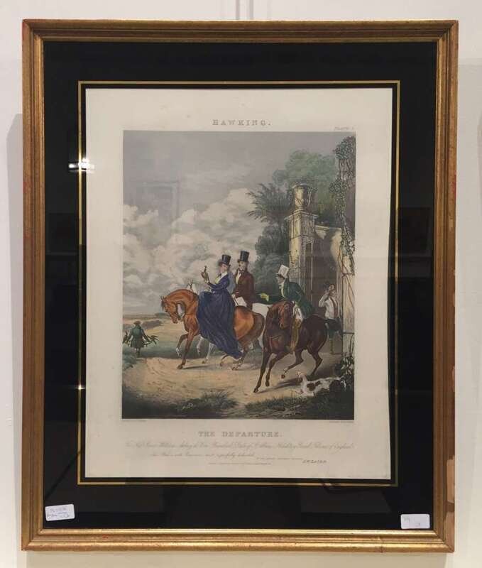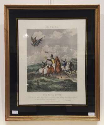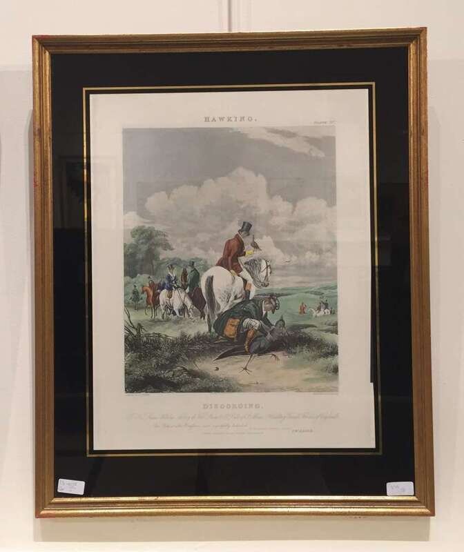 3 Pieces. Hand-Colored Engravings. Reeve, R. G. after Turner F. C. "Hawking." London: I. W. Laird, 1839. 20 1/2 x 16 inches; 520 x 405 mm margins. Scattered light foxing, but bright and attractive in uniform gilt frames. Plates 1, 3, and 4 only: The Departure; The Fatal Stoop; Disgorging.