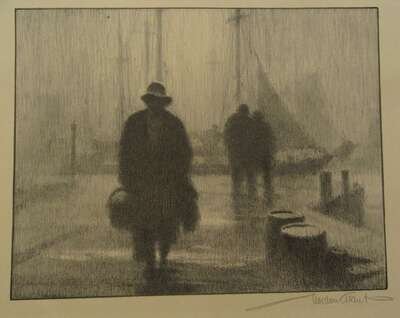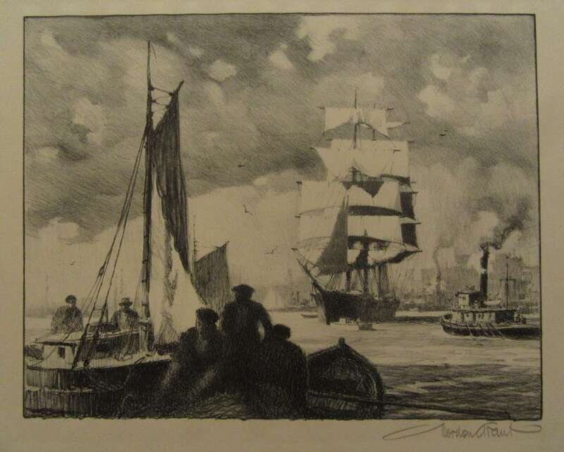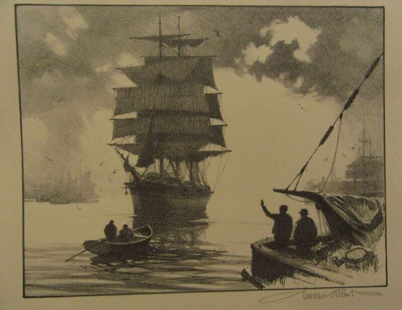 3 Pieces. Lithographs. Grant, Gordon: "Fog Bond." * "Harbor Traffic." * "Home Port." All New York: Associated American Artists, ca. 1940. Each approximately 9 x 11 1/2 inches; 228 x 292 mm, all with full margins. Each signed in pencil below image by Gordon Grant. All crisp and clean with original mats and AAA labels. All full sheets.