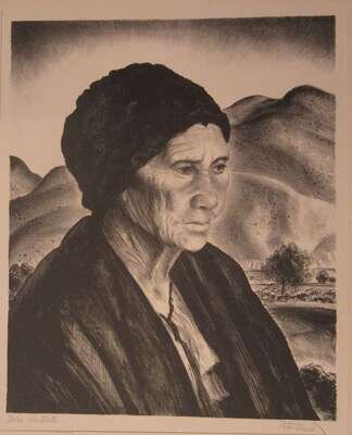 1 piece. Lithograph. Hurd, Peter "Dona Nestorita." New York: Associated American Artists, ca. 1940. 13 1/4 x 11 7/8 inches; 336 x 301 mm, full margins. Titled and signed in pencil below the image by Peter Hurd. Clean and crisp in original mat, with AAA label. The full sheet.
