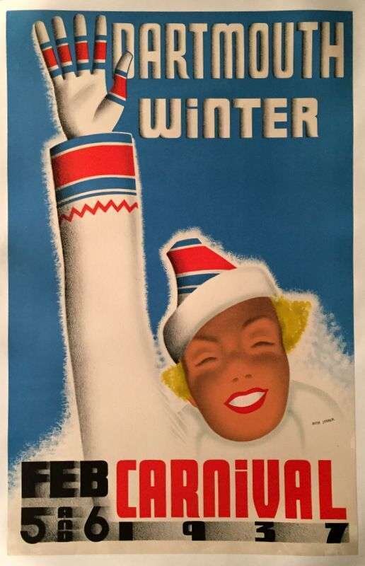 1 Piece. Color Lithographic Poster. Storck, Ruth. "Dartmouth Winter Carnival, Feb. 5 and 6 1937." No place, (1937). 34x22 inches; 874x560 mm, linen-backed. Small, restored tears below image. Bright and attractive.