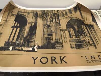 1 Piece. Tinted Lithographic Poster. Taylor, Fred. "York by Liner." London: London and North Eastern Railway, [ca.1930]. 38 1/2 x 48 inches; 978 x 1,220 mm. Linen-backed. Small abrasions to the letters "Y" and "O" in "York," minor repairs and faint staining at bottom margin. Condition B/B+.
