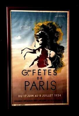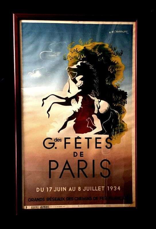 1 Piece. Color Lithographic Poster. Cassandre, A. M. "Grandes fetters de Paris 1934." Paris: Alliance Graphique, 1934. The smaller of two formats, 38 1/2 x 23 1/2 inches; 978 x 597 mm. Condition B/B+, small surface wear, small repair at bottom right corner, edges a little dust smudged. Not examined out of frame.