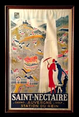 1 Piece. Color Lithographic Poster. de Valerio, Roger. "Saint-Nectaire, Casino... Golf... Station du Rein PLM." Paris: Devambez, [ca. 1930]. 38 7/8 x 24 inches; 987 x 610 mm. Condition B/B+, a few creases, small tears and light fissures in image, but clean and attractive. Not examined out of frame.