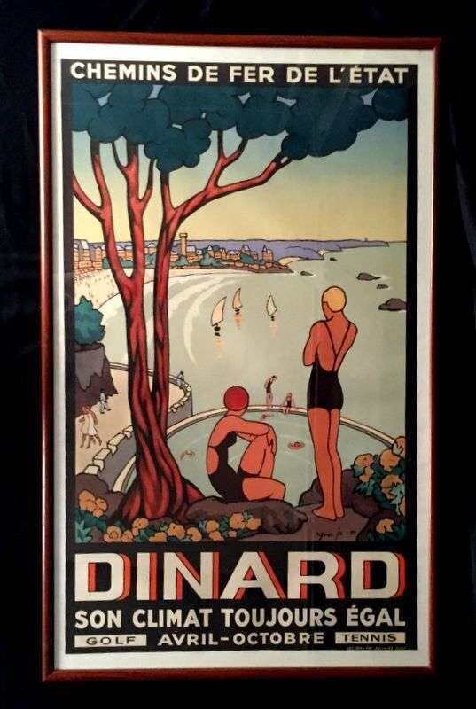 1 Piece. Color Lithographic Poster. Ja, Yves. "Dinard... Golf... Tennis." Paris: Frs. Reunites, 1933. 38 5/8 x 23 1/8 inches; 980 x 587 mm. Condition B/B+, upper left corner expertly replaced, some expert restoration in image, expert repairs at edges, but bright and attractive. Framed.