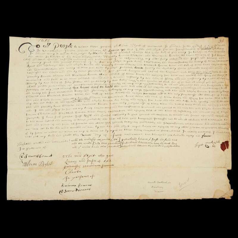 1 piece. Indenture. Massachusetts, 1684. Outlines the sale of Native American territory for the price of one pound and one-half sterling. Confirmed by Sepitt's "turtle"-shaped pictographic signature. Countersigned by various members of the Bourne family, whose name still memorializes the location of this complex transaction.
