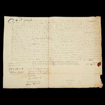 This deed is one among many important manuscripts which John Frederick Lewis, a highly regarded philanthropist, lawyer, and early 20th-century collector, used as primary source material for a comprehensive genealogy of his forbears. His chronological narrative was meant to chart the various world-historical developments and circumstances which ultimately led to the confluence of Mr. Lewis' Continental ancestors and those of the Mayflower Colony, and it extended even to his own lifetime. Housed in altogether fifteen portfolio volumes, the project was the culmination of decades of painstaking research and discerning collecting of the highest order. Most of the manuscripts in Mr. Lewis' collection have not appeared at auction for a century, or more, as evidenced by the clipped catalog descriptions which accompany them.