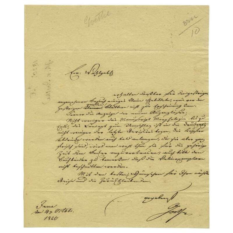 (Estate of John F. Lewis). Goethe, Johann Wolfgang von. Letter Signed. 4 October, 1820. Discusses Goethe's theories on the subject of morphology, and a treatise to be published on the subject. Secretarial hand, closed and signed by Goethe.