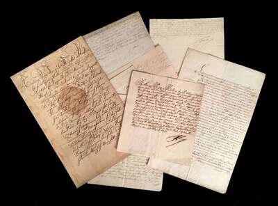 The lot above just a few of the many important manuscripts which John Frederick Lewis, a highly regarded philanthropist, lawyer, and early 20th-century collector, used as primary source material for a comprehensive genealogy of his forbears. His chronological narrative was meant to chart the various world-historical developments and circumstances which ultimately led to the confluence of Mr. Lewis' Continental ancestors and those of the Mayflower Colony, and it extended even to his own lifetime. Housed in altogether fifteen portfolio volumes, the project was the culmination of decades of painstaking research and discerning collecting of the highest order. Most of the manuscripts in Mr. Lewis' collection have not appeared at auction for a century, or more, as evidenced by the clipped catalog descriptions which accompany them.