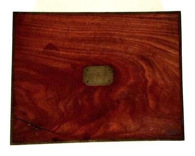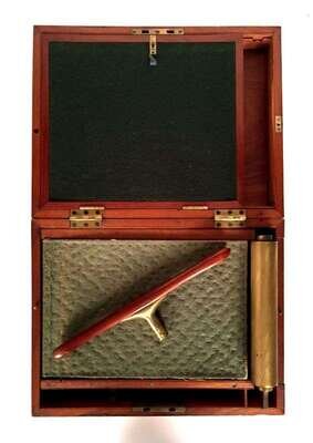 A fin-de-siècle exemplum of that originally patented ca. 1780 by James Watt in collaboration with Matthew Boulton and James Keir ("Patent no 1244"). Brass-bound mahogany case, recessed brass handles; interior compartment with inking tray, original folding hinged writing slope in green baize, integral "damping box", brass rollers, & winding handle. Brass plaque in center of lid; blank, as-issued. Some minor scratches to exterior, one (1) approx 6in split to lid. 15 3/8 x 11 5/8 x 5 ½ in; 392 x 302 x 139 mm.
