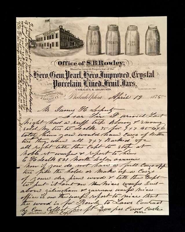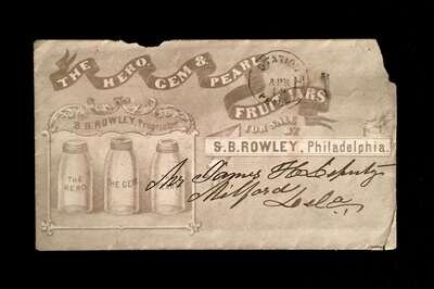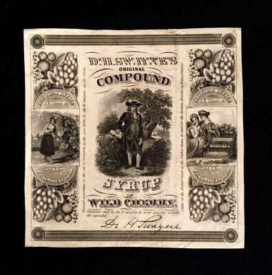(Ephemera). 3 Pieces. 19th-century Job Printing: Engraved pictorial label, " Dr. H. Swayne's Original Compound Syrup of Wild Cherry." 1846. 5 7/8 X 5 7/8 inches; 149x149 mm. Clean & relatively crisp, unused, possible proof. * Engraved pictorial letterhead & envelope for "Office of S.B. Rowley, ... Crystal and Porcelaine Lined Fruit Jars." 1875. Picturing various jars, the glass works bldg. etc. Letter & envelope with user's manuscript.