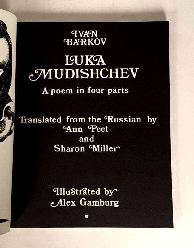(Illustrated and Private Press). (Gamburg, Alex, illustrator.) Barkov, Ivan. Luka Mudishchev: A poem in four parts. No place: Manuscript, Publishing House, (1982).