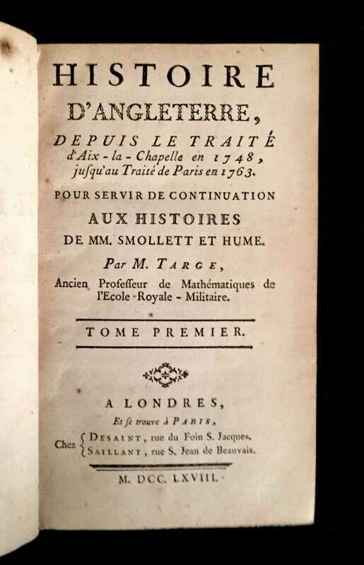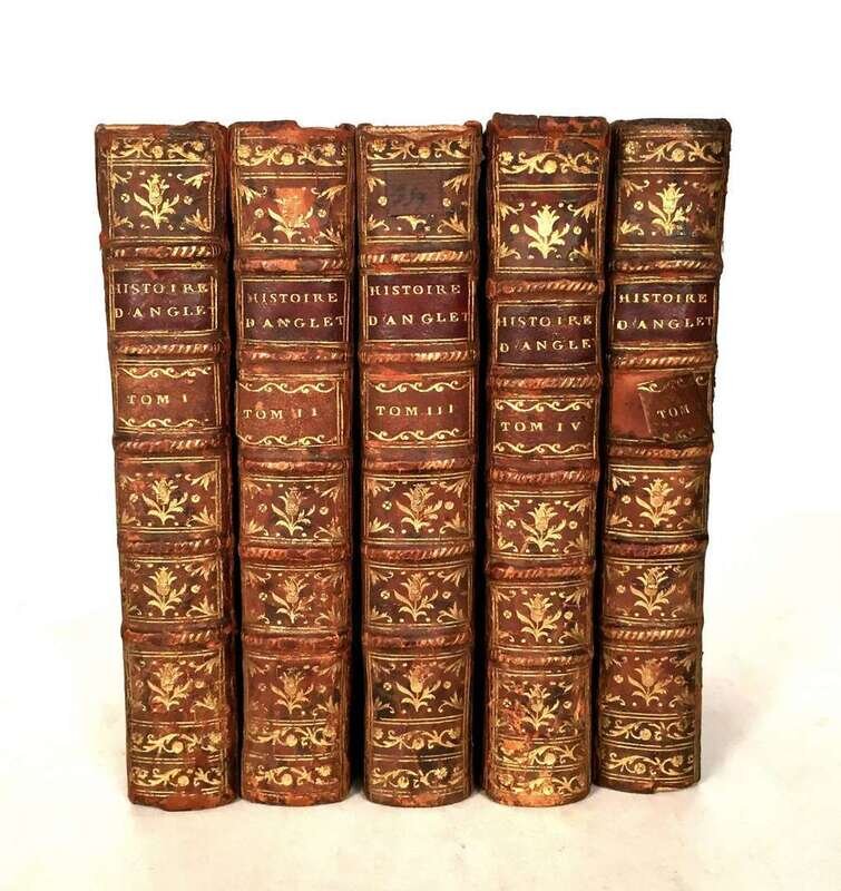 (Literature : French). 5 vols. French Imprints with Princessly Bookplates: Hume, David; Smollett, Tobias. Histoire d' Angleterre. London; Paris: Desaint; Saillant, 1768. 12mo, contemporary gilt-paneled mottled calf, richly gilt foliate spine compartments, morocco spine labels - several starting to detach; joints & extremities rubbed, a few spine heads rubbed away. Internally generally clean. With the armorial bookplate of La Princesse de Turenne née Princesse de Lorraine on each pastedown.