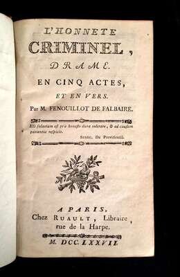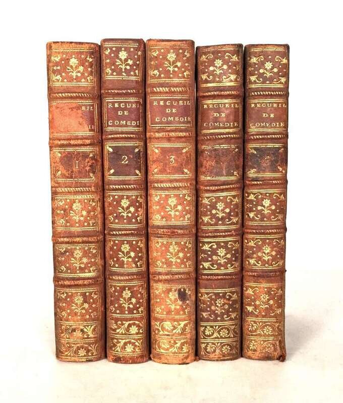 5 vols. 8vo, contemporary uniform mottled calf, gilt-foliate spine compartments, morocco spine labels, red stained edges, marbled end papers; scuffed, corners and spine ends often rubbed. Bound collection of 26 plays, including. Beaumarchais, Pierre Augustin Caron de. La folle journey, ou mariage de Figaro. Lyon, 1785. Without plates. * L' autre Tartuffe, ou la mère coupable. Avignon, Troisième annee, [1794/5]. * ( Richaud, Martelly M.) Les deux Figaro. Paris: Se vend au théâtre de la République, An quatrième, [1795/6]. Internally generally clean, a few plays lightly foxed, trimmed-a few heads shaved close.