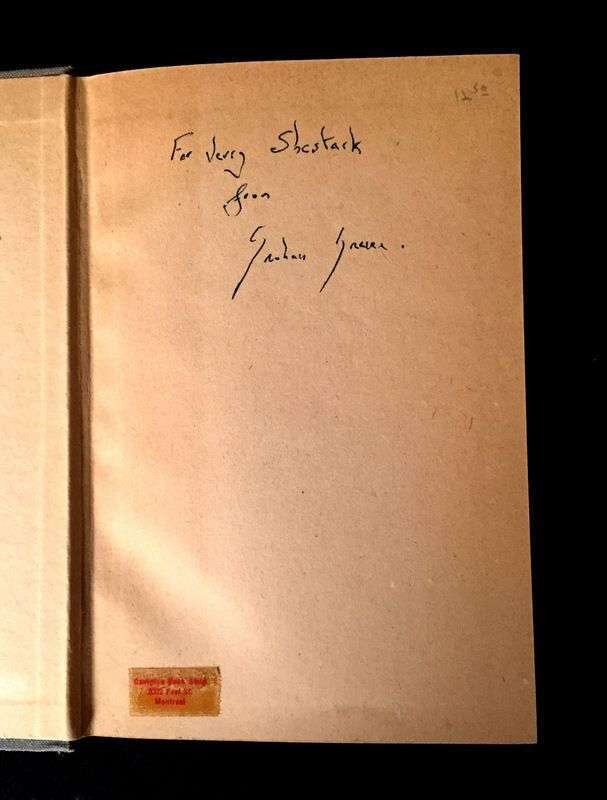 1 vol. Small 8vo, original grey cloth, gilt-lettered spine; light wear, dust jacket (price clipped, bottom 1 1/8 inch of foot of spine panel and the very top of the head of spine panel chipped away - with loss of lettering, top inch of spine panel starting to separate, other small chips at front and back panel edges). endpapers and half title toned. Presentation copy to Jerry [Jerome] Shestack, inscribed and signed by Graham Greene on front free endpaper recto: "For Jerry Shestack/ from/ Graham Greene." Shestack, Jerome, 1923 - 2011, distinguished American Jurist, President of the American Bar Association, U.S. ambassador to the United Nations Commission on Civil Rights. Woobe A27a; Miller 29a.