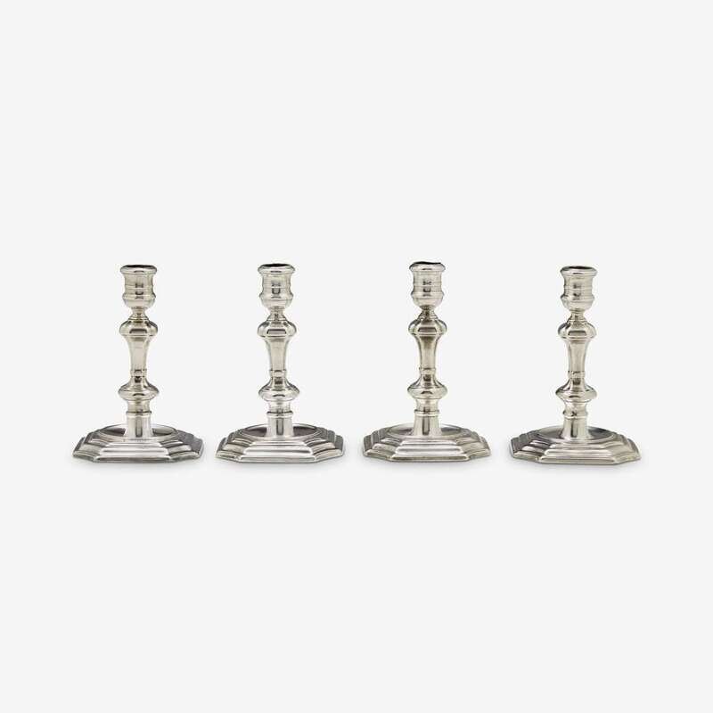 With knopped stem terminating in spool-form nozzle on stepped canted square base; each base indistinctly engraved with a crest. (4).