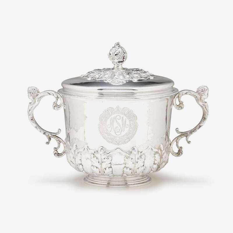 Of typical form, with repoussé-worked acanthus leaves to lower body with twin applied scrolling handles with putti head thumb pieces, the lid terminating in acanthus leaf finial; monogrammed.
